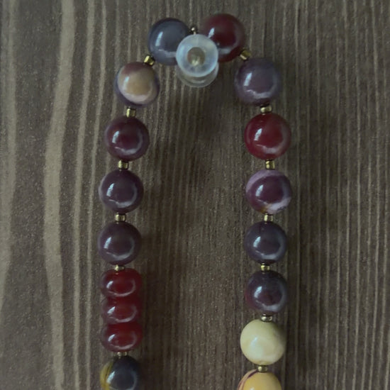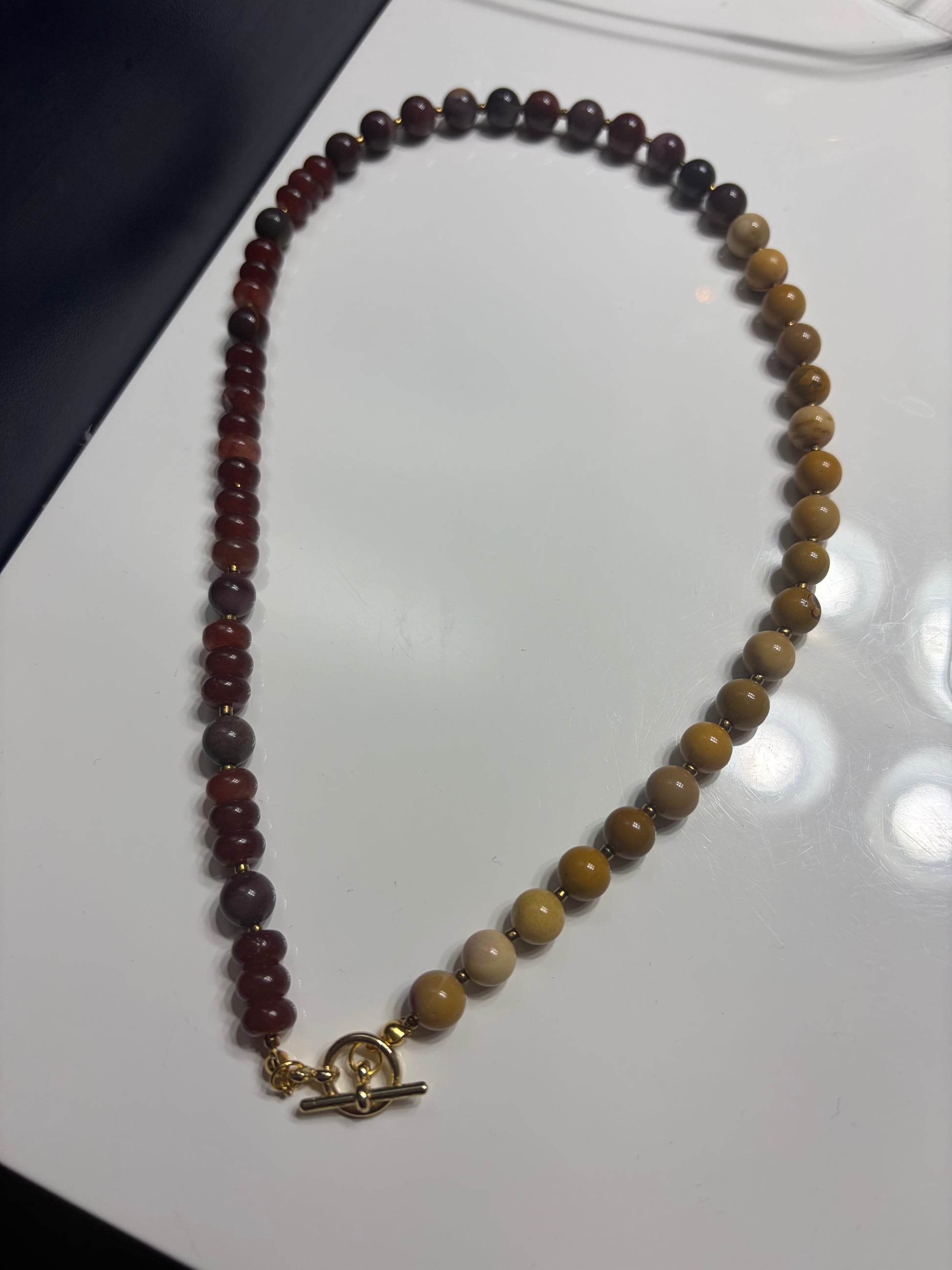 Inspired by the rich tones of fall, this one-of-a-kind beaded necklace features warm shades of mustard, amber, and deep burgundy. Each bead is thrifted and carefully chosen to create a seamless gradient reminiscent of falling leaves and cozy evenings. Finished with a gold toggle clasp, this piece brings the spirit of autumn to any outfit.