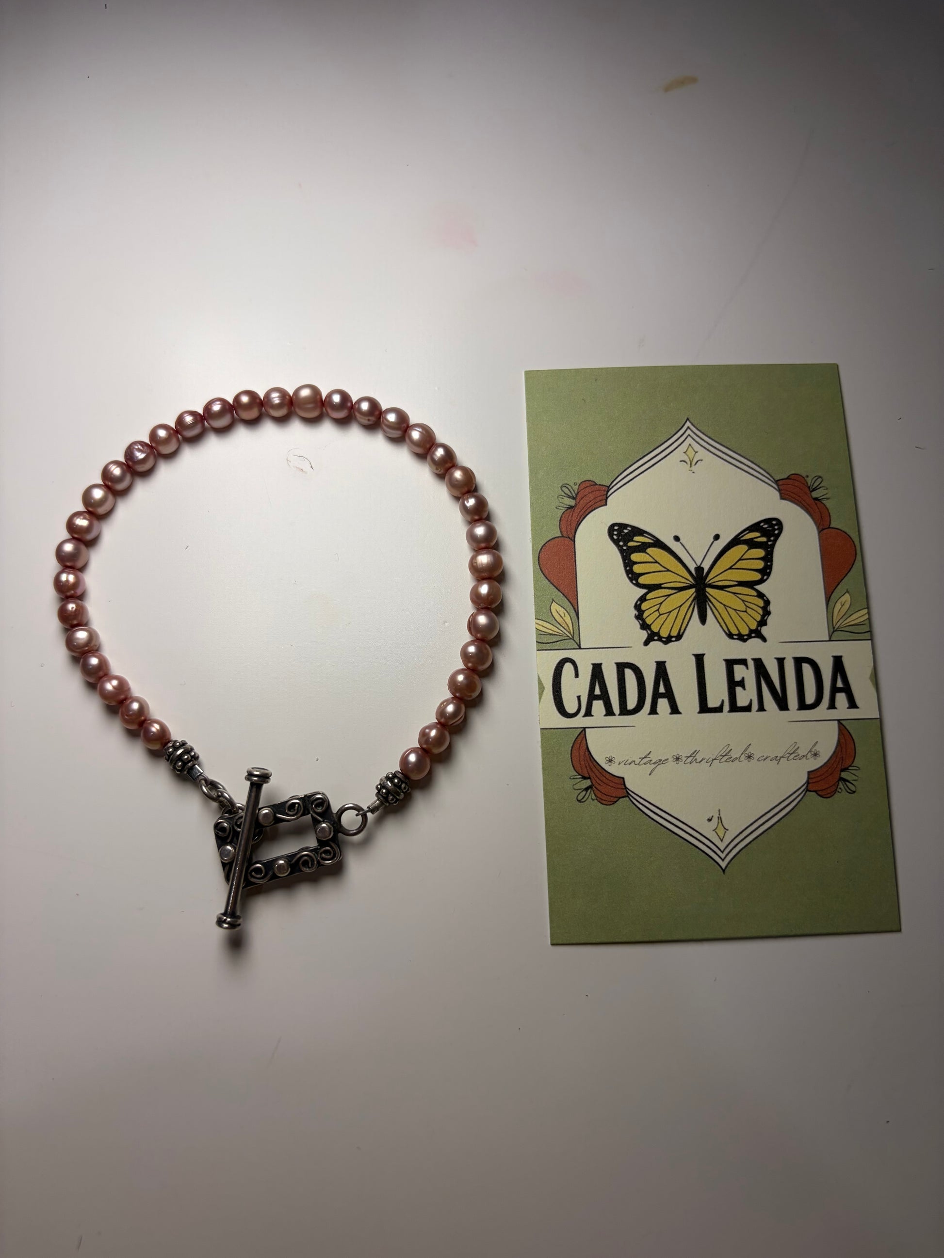 Delicate and timeless, this bracelet features soft blush-toned freshwater pearls and an ornate sterling-style toggle clasp. A classic piece that feels both vintage and modern — perfect for layering or wearing solo.